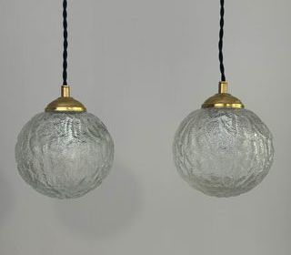 Lot de 2 suspensions rondes en verre texturé.Bel effet de lumière. Rosace de fixation en métal. L'électricité a été refaite. Douille à vis petit culot (Ampoules E14). Branchement