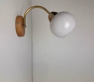 Belle applique vintage en laiton, bois et opaline. Quelques traces du temps. Electricité refaite. Branchement par domino. Douille en laiton à baïonnette (ampoule B22) Diam