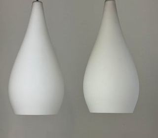 Lot de 2 suspensions en opaline. En bel état général. L'électricité a été refaite. Douille à vis petit culot (Ampoules E14). Branchement par domino. Fil noir en tissu tressé et