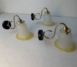 ENVOI POSSIBLE Achat sécurisé sur notre site internet nikel-forms Adresse sur simple demande Trio d'appliques vintage avec abat-jours en verre épais bicolore. En bel état g