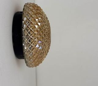 Petite applique ronde vintage en verre ambré des années 1970. Base en métal. Belle lumière. L'électricité a été refaite. Douille à baïonnette (Ampoules B22). Branchement par domin