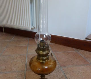 LAMPE A PETROLE EN VERRE ET BRONZE HAUTEUR 50 CM. EXCELLENT ETAT A PRENDRE SUR PLACE .
