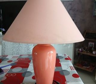 Lampe avec pied en céramique de couleur pêche et abat-jour de couleur assortie. Le câble d'alimentation est visible et semble en bon état.