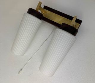 ENVOI POSSIBLE Belle applique scandinave en bois et laiton. Les abat-jours sont en opaline cannelée. Interrupteur à tirette. En bel état général. Quelques traces du temps. El