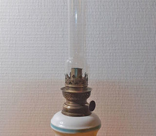 Lampe à huile, faïence peinte, très bon état Hauteur totale 45 cm Hauteur corps peint 15 cm, diamètre max. 10,5 cm Longueur cylindre verre 25 cm, diamètre cylindre 2,5 cm
