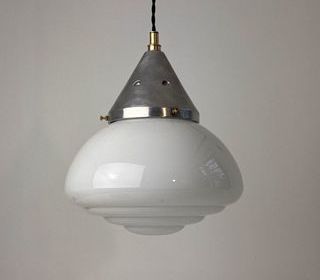 Magnifique suspension en opaline. Année 1930. En bel état général. L'électricité a été refaite. Douille à vis gros culot (Ampoules E27). Branchement par domino. Fil noir en tis