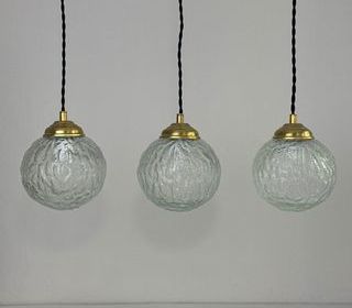 ENVOI POSSIBLE Trio de 3 suspensions rondes en verre texturé.Bel effet de lumière. Rosace de fixation en métal. L'électricité a été refaite. Douille à vis petit culot (Ampoul