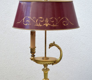 "Lucien Gau ? Lampe bouillotte Directoire, modèle 16031" Lampe bouillotte Lucien Gau Modèle Directoire, Réalisée en bronze patiné et doré, elle se compose d'un fût central élanc