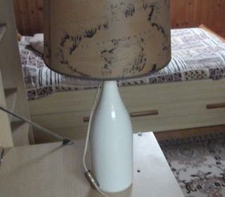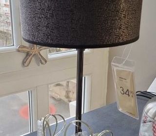 Cause double emploi, vends cette lampe à poser avec socle en verre peinture époxy et abat-jour décoratif. Dimensions de l'abat-jour : diamètre 30 cm en bas, 25 cm en haut, hauteur