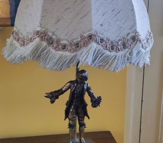 Ravissante lampe de salon en parfait état avec chapeau Interrupteur fluorescent Douille pour lampes à baillonette Dimensions Ht personnage 25 cm Ht douille 35 cm Socle 14 cm