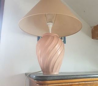 Lampe à poser rose Dimensions : Hauteur : 65 cm Grand diamètre du chapeau : 65 cm Petit diamètre du chapeau : 18 cm Petit diamètre du pot : 10,5 cm A prendre sur place Pour
