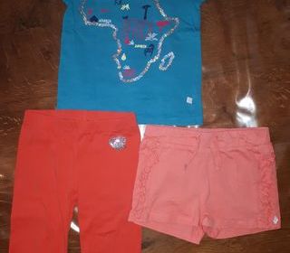 Lot fille été la compagnie des petits 6 ans très bon état. Un t-shirt turquoise un legging orange et un short rose.