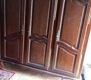Donne une armoire avec trois portes une avec 4 étagères et deux portes avec penderie elle fait 1m70 de longueur 1 m 80 de hauteur et 0.60 de large à démonter sur place