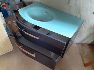 Donne meuble vasque pour salle de bains, plan verre turquoise épais, deux tiroirs avec amortisseurs avec système d'accroche murale. Une poignée de tiroir rénovée bois.