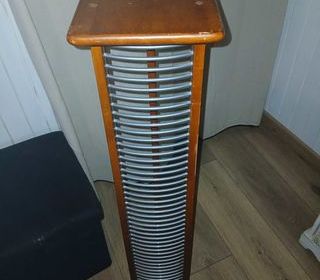 Donnes petit tapis rouge à motifs géométrique, tour à cd bois marron foncé, petit meuble colonne 1 porte et 2 tiroirs panier , un range chaussures échelle de porte blanc. pas sé