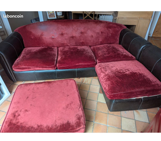 Canapé convertible en lit 2 places. Lit confortable et grand. 2,50m de long, 93 cm de profondeur Velours bordeau, accoudoirs et dos en cuir. 1 chauffeuse et 1 repose pied. Pe