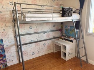 Vend lit mezzanine 1 place, utilisé pour une chambre d'enfant. Dimension : Longueur 206 cm Largeur 95 cm et + 40cm du côté de l'échelle Hauteur 147cm pour le matelas, 186cm pou