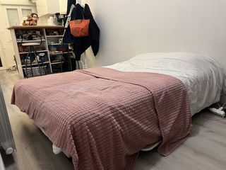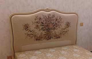 Ensemble lit forme corbeille avec tête et pied de lit en tapisserie très fine et sommier. Encombrement total : 160 x 210 cm. Couchage 140 x 190. Matelas offert