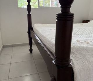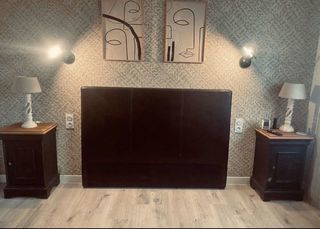 Cause vide-maison, je vends une chambre complète en bois massif, comprenant lit , armoire et chevet assorti. Ensemble solide, élégant et prêt à l'usage. Lit double en bois mas