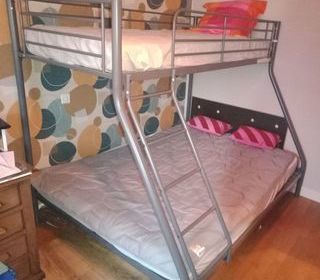 N a servi que 3 fois, permet de coucher 3 personnes enfant ou adulte. Sommier à lattes intégré au cadre. Matelas non fournis. Dimension : Lit 2 personnes : 140 x 190 Lit 1