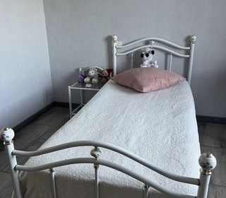 Tour de Lit romantique en métal blanc avec boules en porcelaine + sommier tapissier + matelasBULTEX MELIA. dimension 90 x 190. avec chevet assorti. Ensemble propre et en bon état