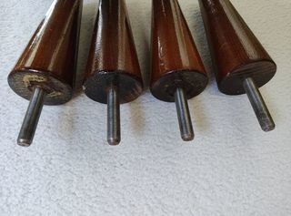 Lot de quatre pieds de lit en très bon état, Bois massif Couleur chêne foncé Hauteur des pieds installés 12,5cms.