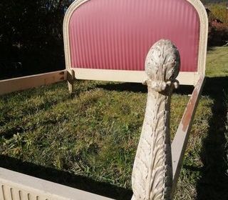 Cadre de lit dimension 140X190 de Style LOUISXVI "BORRELLI " , tête de lit en tissu des Vosges coloris vieux rose en parfait état , le cadre est à rénover en peinture !