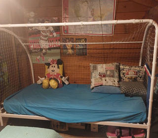Joli lit pour enfant en forme de cage de foot (dim. 90) avec son matelas - TBE - en fer blanc