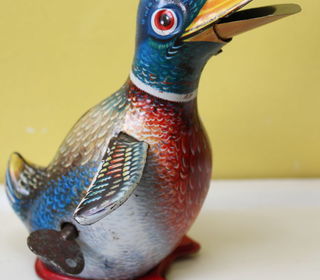 Canard automate tôle lithographiée JOUSTRA bat des ailles fait du bruit et avance en se dandinant aile et bec restaurés clef fournie Envoi possible Rmp métro Corentin Celton.