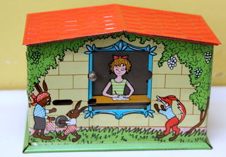 Tirelire à système tôle lithographiée la petite caissière complète Dimensions : 8,5 X 6,5 X 13 cm TBE Envoi possible RMP métro Corentin Celton