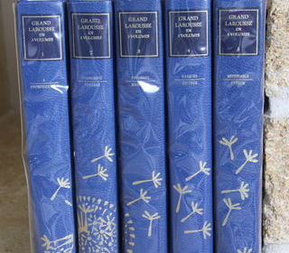 Vends 5 volumes grand Larousse TBE, couverture simili cuir bleu rigide protégée par plastique d'origine, édition 1992. Ce dictionnaire de référence contient 116 000 articles, 4450