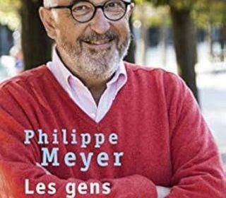 Livre de Philippe Meyer intitulé "Les gens de mon pays". Couverture souple, état neuf. Visible sur la couverture, l'auteur est représenté souriant, habillé d'un pull rouge. L'arriè