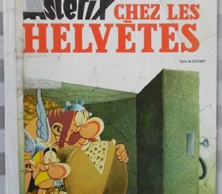 UNE AVENTURE D'ASTERIX LE GAULOIS ? ASTERIX CHEZ LES HELVETES Dessins de UDERZO - Texte de GOSCINNY Editions DARGAUD - imprimé en France en Juin 1985 Etat moyen, le dos du liv