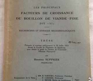 Hermine Suppiger Thèse de Dr de l'université mention Pharmacie université de Strasbourg examinateurs Sartory , Cordier , Meyer imprimerie des arts Sussmann 1953 bon état