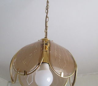 Luminaire pour chambre ou couloir. Couleur doré et verre teinté. Elément décoratif. Peut se régler en hauteur à l'aide des maillons d'une chaînette de suspension.