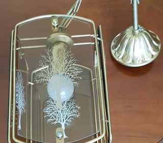 Luminaire suspension en métal doré avec 4 faces en verre, plates et rectangulaires, avec motifs sérigraphiés Hauteur partie vitrée : 21cm Hauteur totale : 53cm, réglable. Excell