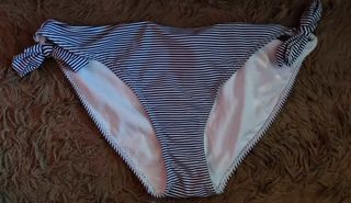 Je vends ce maillot de bain 2 pièces de taille 46 en rayures bleues et blanc. - Type de produit : Maillot de bain 2 pièces - Taille : 46 - XXL - Couleur : Marine / blanc - Caractér