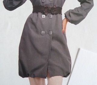 Joli trench ou imperméable gris, forme boule en bas et au bas des manches, fermé par double boutonnage fantaisie (boutons de forme carrée), ceinture amovible. 2 poches dans les cou