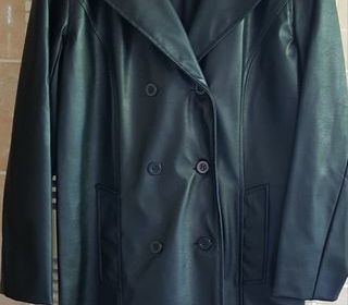 Manteau imitation cuir noir NEUF Taille 38 Doublure polyamide noire Double boutonnage 2 poches Longueur milieu dos : 97cm Largeur épaules : 42cm Lavable à 30° Annonce en li