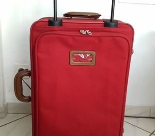 Valise en toile rouge Lancel à roulettes avec 2 poignées cuir et porte-étiquette cuir. Un grand compartiment avec poche intérieure, 2 autres compartiments extérieurs, plus une po