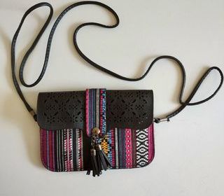 Sac à bandoulière tissage indien recto/verso , orné de motifs multicolores et de découpes florales sur le rabat. Caractérisé par un design vivant avec des pompons décoratifs à la f