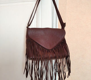 Sac à franges en cuir lisse souple, coloris marron-bordeaux. Rabat fermé par bouton aimanté. Porté épaule grâce à sa longue bandoulière ajustable. Attaches en laiton vieilli. Plusi