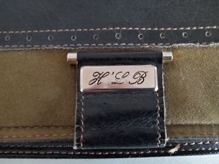 Porte feuilles en cuir, excellent état. Très beau portefeuilles/monnaie en cuir. Angles renforcés par protection laiton, fermeture par patte avec ?illet. Dimensions fermé: 17