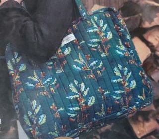 Ensemble Forêt d'automne - Grand sac genre fourre-tout 64x38x13cm 65 % coton recyclé 35 % coton - Trousse 22x15x10cm 80% polyester 20% coton - Pochon 30x40cm microfibre et p