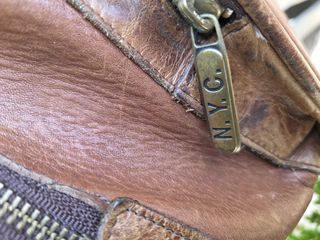 Beau sac à dos en cuir marron, fond frappé de la marque M LONDON N.Y.C, avec inscription made in USA leader craft - boucles et mousquetons étain, hauteur 40 cm, largeur bas 25