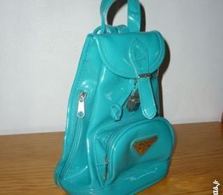 Joli petit sac à dos vernis bleu turquoise. Dimensions : 23 cm H x 17 cm L à la base. Bandoulières réglables. 2 petites poches extérieures zippées.