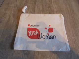 Trousse beige, de la marque originale Forté Pharma Laboratoires, avec inscription sur le devant "XTRA WOMAN", dos uni, fermeture par fermeture éclair beige, tirette de couleur