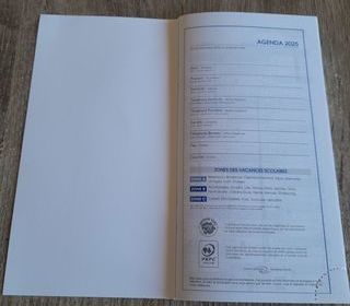 Recharge pour agenda de poche 2025, du 23/12/24 au 04/01/26, composé de : page mémento (nom, coordonnées, etc.), planning 2025, vacances scolaires 2025, calendrier 2025, jou