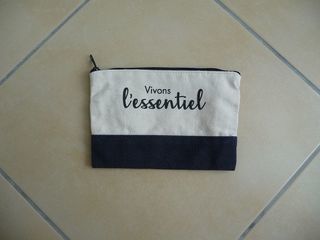 Trousse avec message "Vivons l'essentiel", marque Camaïeu, en coton bicolore écru et marine, entièrement doublée coton, glissière bleu marine. Dimensions approximatives : 18 x 12