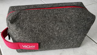 Vends une trousse de toilette rectangulaire : - Marque : VICHY Laboratoires. - Couleurs : gris et rouge. - Fermeture zippée rouge. - Dimensions : Longueur 20 cm ; Largeur : 8 c